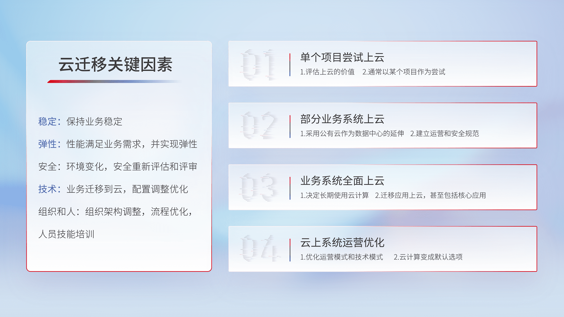 结合实际业务,,,,从规划设计、、云平台选型、、、、云原生改造、、、数据迁移、、集成交付,,,,迁移全过程为客户识别最佳上云路径,,,,做好风险识别管理,,,设计网络架构、、身份权限、、安全审计合规、、、操作审计、、、、日志审计、、、、监控告警策略、、、、多站点容灾设计等,,对云上基础设施进行整体规划,,,,提升IT治理水平,,,,以满足弹性、、高可用、、、高性能的需求。。